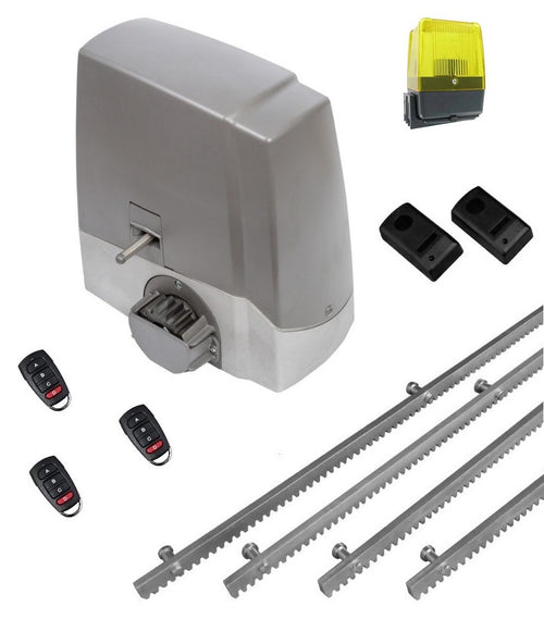 Σετ μηχανισμού για συρόμενη γκαραζόπορτα με μοτέρ PROTECO MEKO-5, για έως 500 κιλά πόρτα ενσωματωμένο πινακοδέκτη , 4m μεταλλική κρεμαγιέρα, 1 ζευγάρι φωτοκύτταρα ασφαλείας, 1 φανό και 3 τηλεχειριστήρια . Περιλαμβάνονται: βάση στήριξης, λαμάκια ενεργοποίησης τερματικών διακοπτών, κλειδιά αποσύμπλεξης, οδηγίες εγκατάστασης στα Ελληνικά κλπ. Για μέγιστο βάρος θυρόφυλλου 500 Kg.
