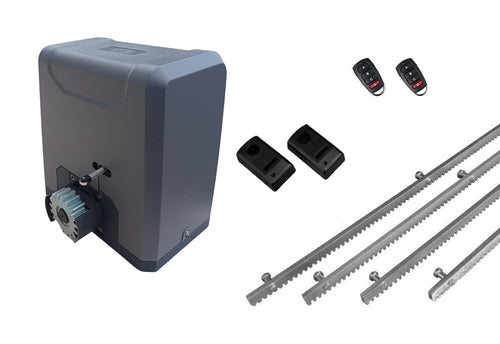 Σετ μηχανισμού για συρόμενη γκαραζόπορτα για μέγιστο βάρος θυρόφυλλου 1000 Kg, με μοτέρ SL1000AC με ενσωματωμένο πινακοδέκτη, 4m μεταλλική κρεμαγιέρα module 4, 2 τηλεχειριστήρια σταθερού κωδικού και ένα σετ ενσύρματα φωτοκύτταρα ασφαλείας. Περιλαμβάνονται βάση στήριξης, λαμάκια ενεργοποίησης τερματικών διακοπτών, κλειδιά αποσύμπλεξης, οδηγίες εγκατάστασης κλπ.